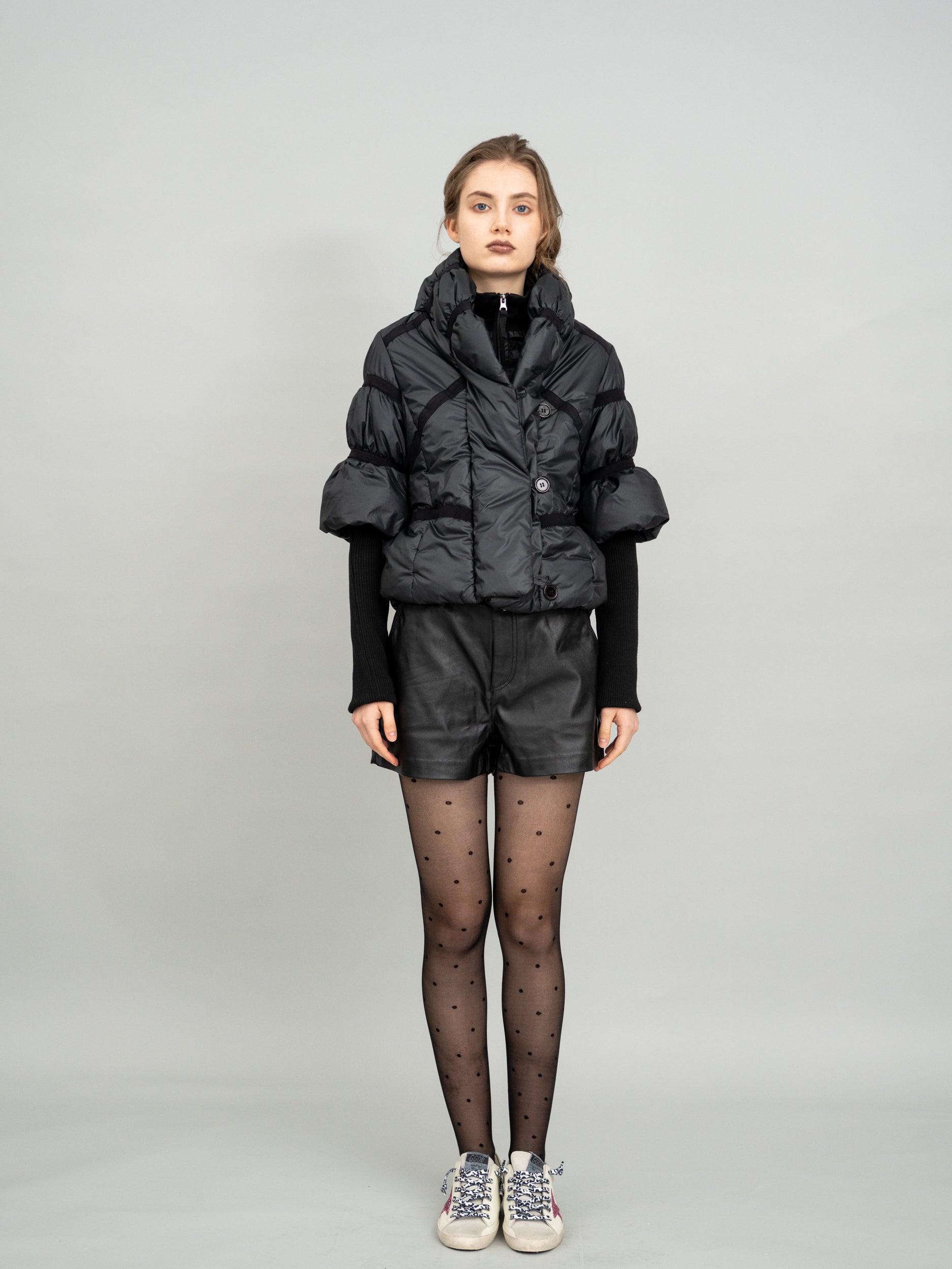 The Pixielulu Featherlite Black Puffer Crop Jacket features a modern, short silhouette in glossy black quilted fabric, designed for both style and warmth with its stand-up collar. The puffy sectioning keeps it lightweight yet structured, and the cropped fit accentuates the figure. Styled here with a black turtleneck, leather shorts, sheer polka-dot tights, and retro sneakers, this look channels energetic street style, making it a must-have for sporty autumn-winter city outings.