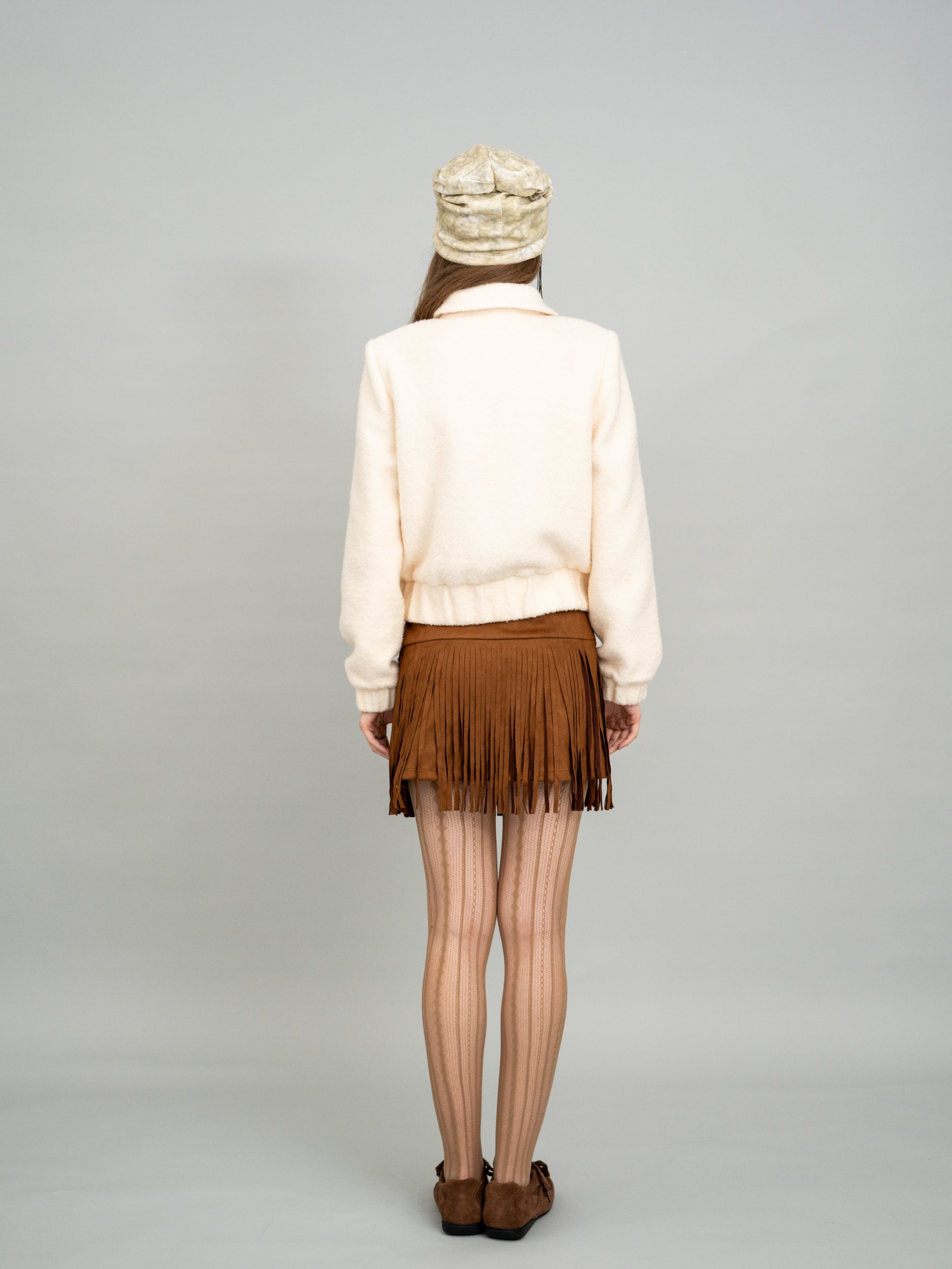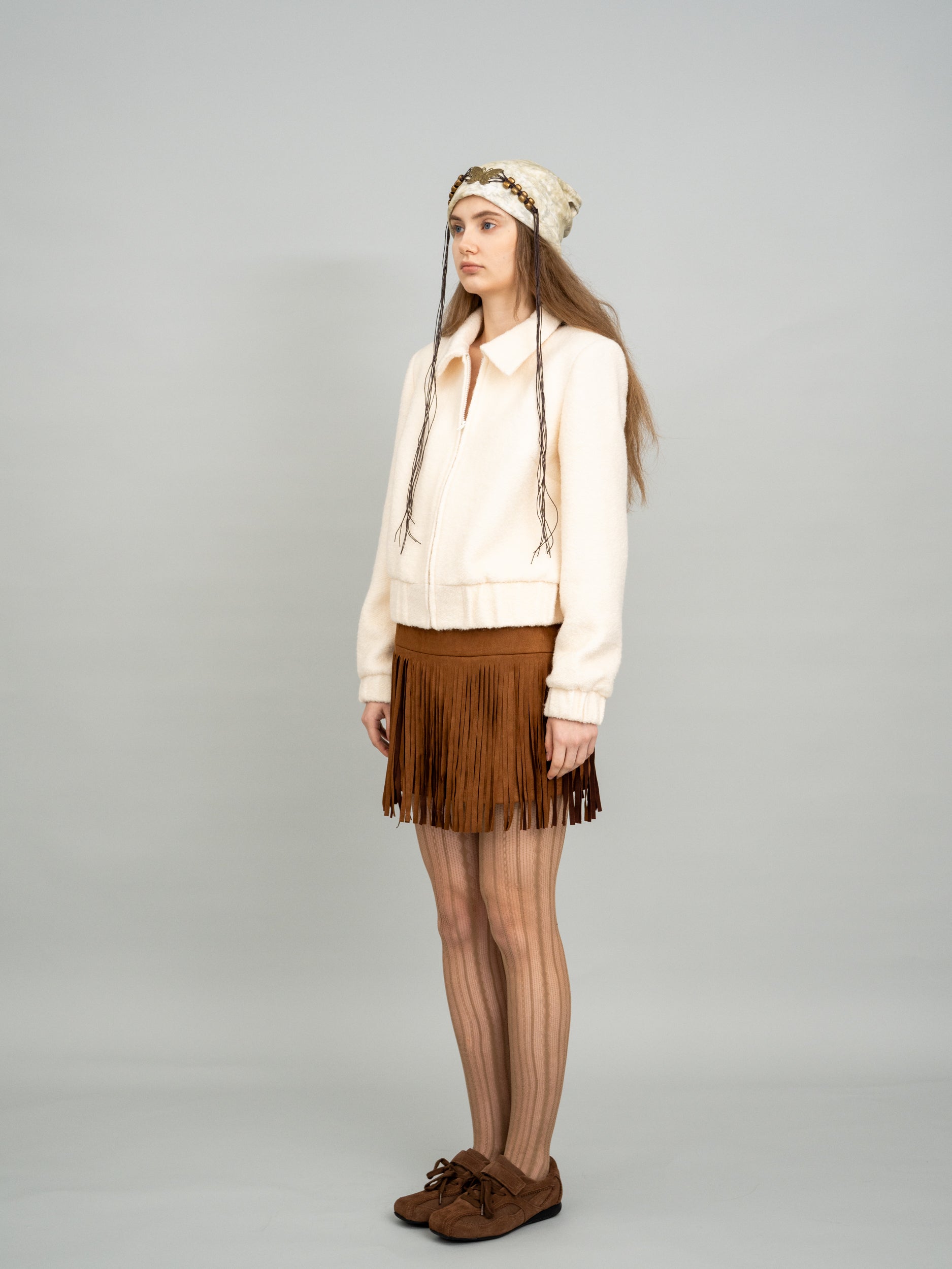 The Pixielulu Ivory Zip-up Wool Cropped Jacket features clean lines and a modern zip front. Made from soft wool blend, its cropped fit flatters the frame and brings playful winter vibes. Styled here with a floral headband and fringe skirt for a sweet, girlish effect.