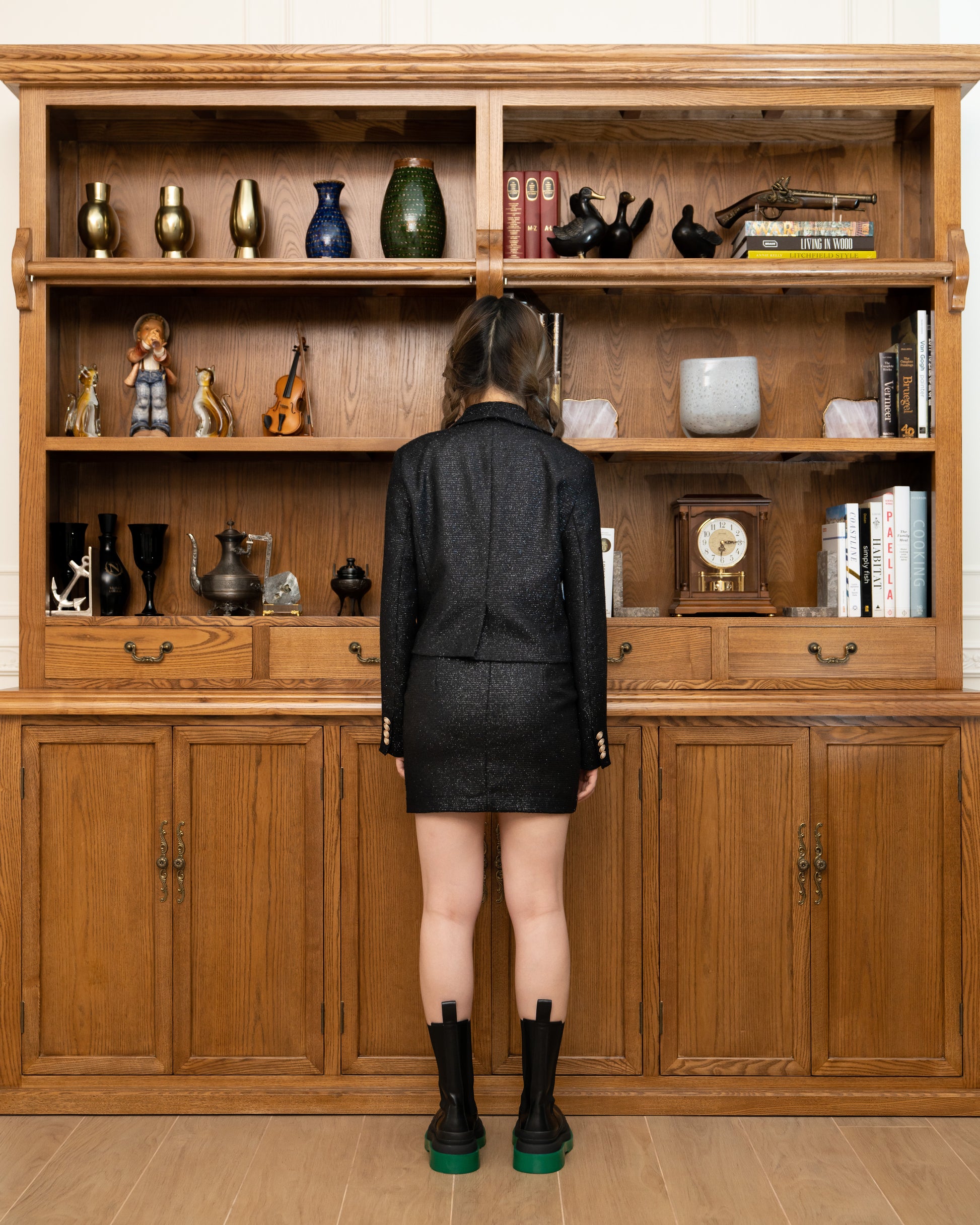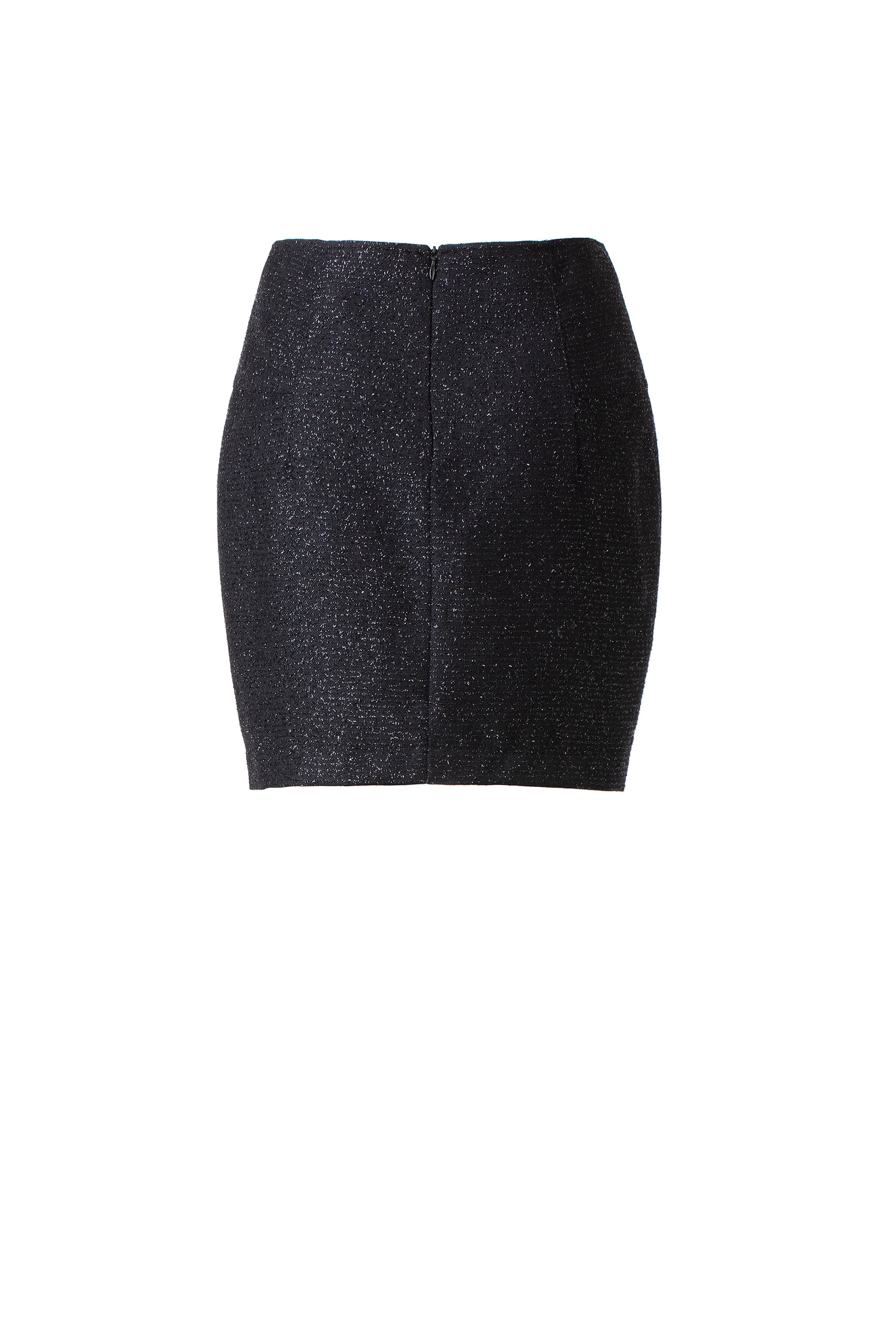 This sparkly lurex mini skirt is high waisted. It’s cut for a slim fit with a slit at the front bottom. It can be mixed and matched to create a formal or casual look. We have a matching fabric cropped jacket for a full set.