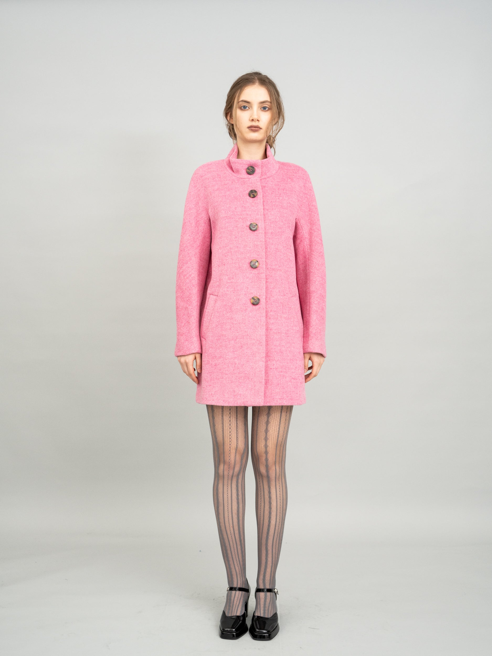 This lovely coat in soft rose-pink features a refined stand collar and a vertical row of buttons down the front. The piece has a slightly relaxed fit with long sleeves and practical side pockets, falling to an elegant above-knee length. The delicate pink hue and clean, minimalist design create a feminine yet sophisticated look that's perfect for spring transitions.
